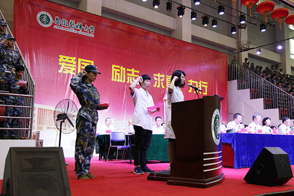 会上,军训团田义博同志代表全体军训教官发言;校中青年学术带头人、护理学院院长、博士生导师洪静芳携新老生代表,带领2018级全体新生进行了医学生入学宣誓。