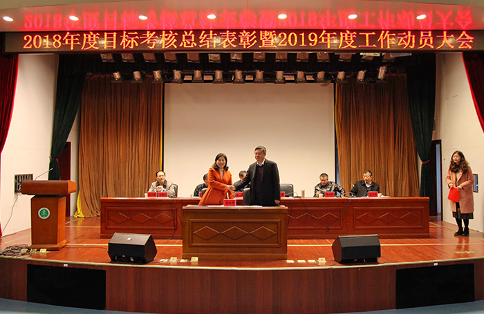 3月6日下午,学校在图书馆第一学术报告厅召开2018年度目标考核总结表彰暨2019年度工作动员大会,校领导李俊、曹云霞、刘群英、常业军、肖圣龙出席会议,副校长余永强主持会议。