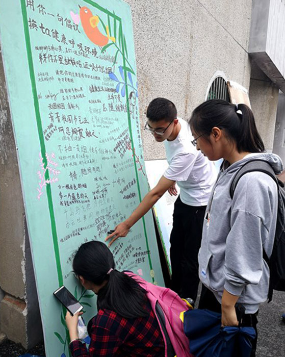 活动期间,该院“微暖”志愿服务队在校园内举行了禁烟知识宣传。志愿者通过现场问卷调查、讲解、张贴禁烟倡议书、发放宣传手册等方式向同学们宣传吸烟对身体的危害,倡导大家争做文明学生,共建无烟校园。志愿者还邀请同学在禁烟倡议板上书写禁烟宣言,表明禁烟决心,为事先准备的“表情包”配上禁烟宣传口号,并将制作作品送给参与活动的同学们,张贴在寝室。除了线下活动外,该院还利用QQ空间、微信公众号开展宣传,进一步扩大宣传范围、强化宣传效果,有趣的活动方式吸引了大批同学参与。
