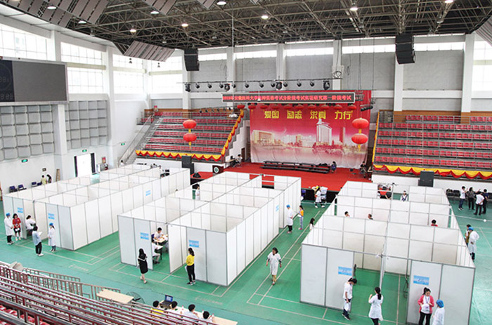 我校2015级临床医学816名学生参加了考试,考试分为医学基本知识考试(理论考试)和临床基本技能考试(技能考试)两部分。5月31日上午,理论考试在人文医学学院进行机考,这也是我校又一次举行成规模的医学综合计算机化考试。5月31日下午至6月2日上午,技能考试由第一附属医院牵头,在校体育馆和知行楼B座设九个考试组,每组六站同步进行,分别考查考生的病史采集、体格检查和基本操作技能,将沟通交流能力、人文关怀融入其中进行综合评价。