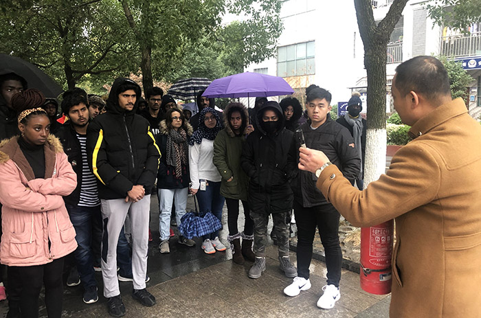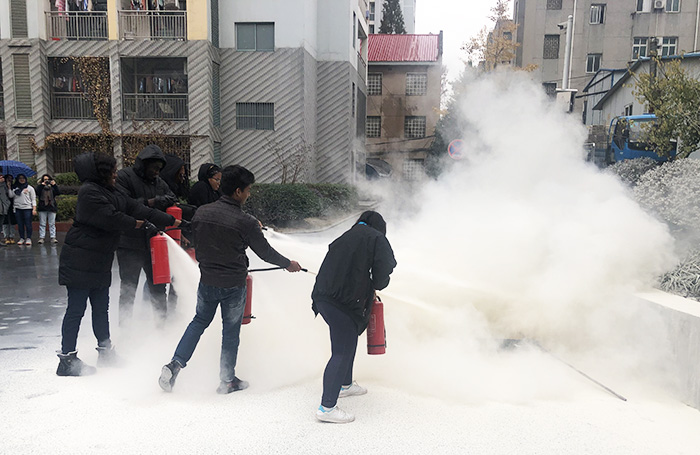 保卫处消防科相关负责人就冬季消防形势以及高层消防安全现状作简要介绍,讲解了常见火灾隐患及其危害性、初期火灾扑救要点等消防知识,并现场对灭火器的种类、使用方法以及注意事项作说明示范。国际学生分为8组,在工作人员的引导指示下,按照示范要求使用灭火器进行了灭火实战演练。
