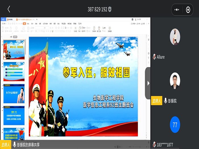 措施上全面到位。为进一步保证大学生征兵宣传动员工作实现全员、全域覆盖、不留死角、精准动员,该院各班以“参军入伍 报效祖国”为主题,开展了线上主题班会,从国家战略高度、政治态度、历史责任、成长成才等方面。对大学生参军入伍的工作进行了生动宣传,对优先征集、保留学籍、学费资助、士兵提干、考研加分、安徽省3项优惠政策、学校关于退役复学大学生转专业等大学生应征入伍优惠政策进行了具体讲解,对《建设世界一流军队》《明日英雄》《从此不同》征兵公益宣传片进行了集中展播。以在线沟通交流的方式,号召青年学子增强自身使命感和责任感,以坚毅的决心积极投身国防安全事业,勇担强国富民、民族复兴的时代大任。