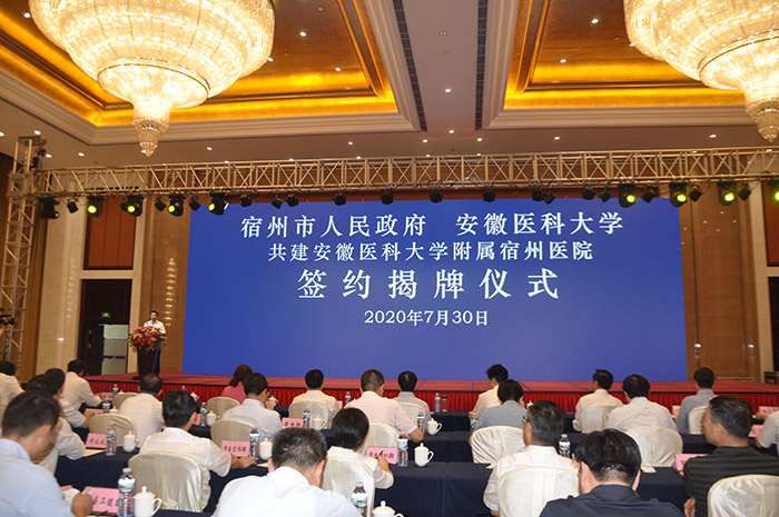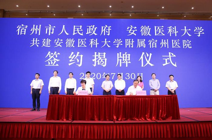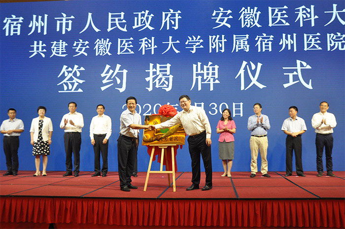 7月30日上午,我校与宿州市人民政府共建华体会平台附属宿州医院签约揭牌仪式在宿州举行。校党委书记顾家山、宿州市委书记史翔出席仪式并共同为华体会平台附属宿州医院揭牌。校长曹云霞,宿州市委副书记、市长杨军,市政协主席许广斌,校党委副书记刘群英,副校长余永强,宿州市委副书记、宣传部长余向东,市委常委、秘书长孟伟,副市长马杰,市政府秘书长吴绪峰出席仪式。仪式由余向东主持。