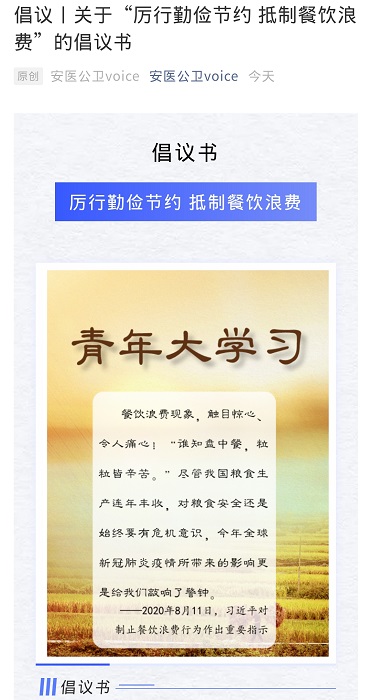 该院还利用微信公众平台发布《厉行勤俭节约,抵制餐饮浪费》倡议书,号召全体师生响应习近平总书记号召,爱惜粮食、勤俭节约、居安思危。