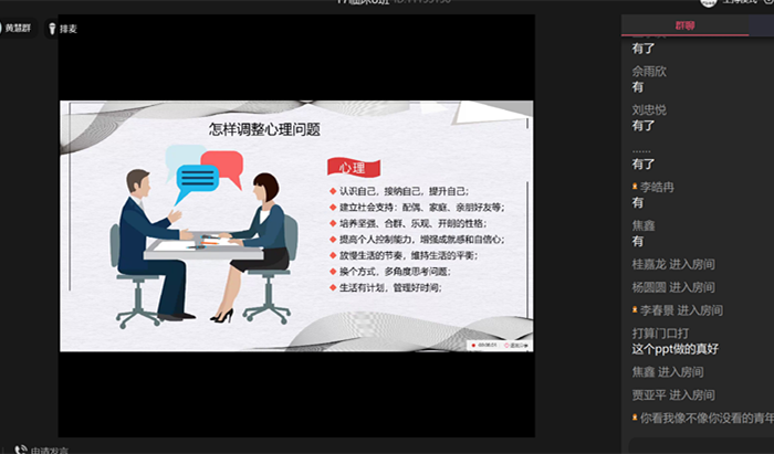 主题班会,营造心灵港湾。针对返校学生遇到的适应不良等问题,该院辅导员、班主任分别组织各小班召开了线上心理健康教育主题班会。同学们在线上通过PPT解说、观看视频、交流互动等形式,展示了疫情防控期间在家的学习生活心得,交流了心理不适调节方法,分享了心理健康保健知识。大家讨论热烈,气氛融洽,也进一步增强了班级集体凝聚力和向心力。