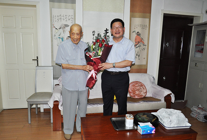 顾家山来到百岁抗战老战士徐亚球家中,热情握住老人双手,与其亲切交谈。他详细询问了老人身体生活状况,衷心祝愿老人生活幸福,健康长寿。顾家山与徐老一起深情回忆战火纷飞的革命峥嵘岁月和学校百年发展历程,并向其介绍了学校建设发展情况,希望他能继续为学校建设与发展积极建言献策。