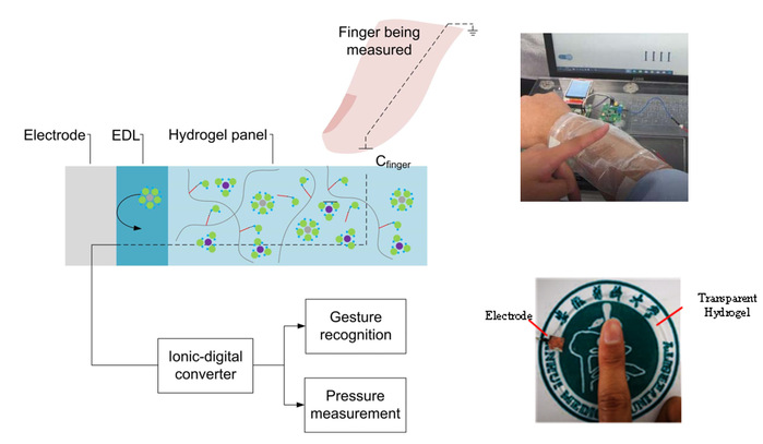 研究成果中显示,该研究团队结合水凝胶材料技术与电子技术,提出了一种具备生物相容性、可降解性的可穿戴传感器系统,实现了具备皮肤亲和性的水凝胶触控板,以及仅需小尺寸电路系统即可完成从“离子电流-电子电流-数字化系统”的信号转化,并实现了多种人机交互功能。