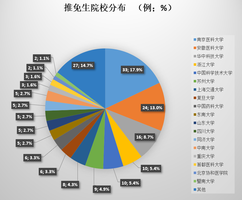 推免院校中,既包括北京大学、中国科学技术大学、复旦大学等综合性大学,也有北京协和医学院、同济大学医学院等医学类高校;推免生选择的学校,则多是长三角地区的地理位置好、综合实力强的双一流高校。其中,南京医科大学、华体会平台、华中科技大学推免人数排名前三,选择在母校继续深造的学生达24人,占推免总数比约13%。