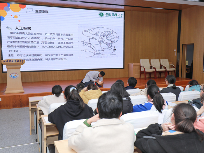 座谈交流后,开展了安医大2021年招生宣讲会和急救科普知识进校园活动。薛磊向参与活动的100余名高中生介绍了安医大历史沿革、发展现状、医学生成长成才历程和第一临床医学院学生教育培养特色,该院学子讲解并现场示范了心肺复苏术等急救知识操作的细节和要点,并邀请高中生上台进行模拟操作,让高中生们对“救死扶伤、护佑健康”的医学专业有了更直观的理解和认识。