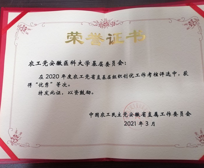 3月19日,农工党安徽省委会直属工委召开2020年度工作总结暨表彰会议,农工党安医大基层委荣获“优秀”等次荣誉表彰。