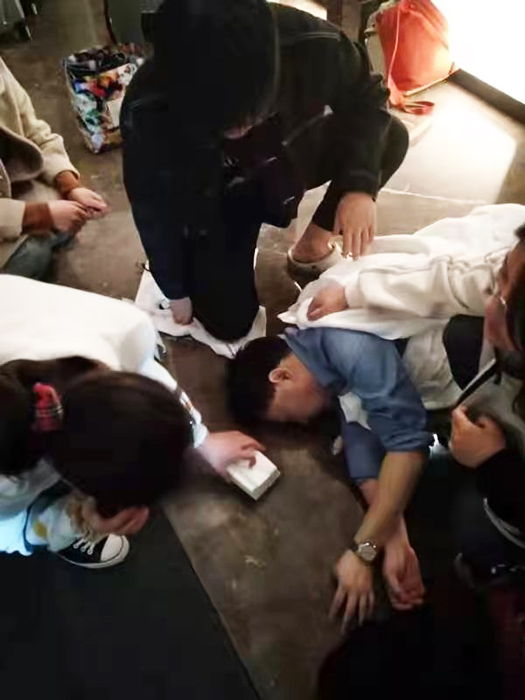 “我们当时同在一部电梯,他毫无征兆地倒在地上,现场的人都很慌张。”同学们回忆起当时的情形,仍觉得十分紧急。“邱健与吴钰首先将倒地男子转移出电梯、进行简单查体后将患者头偏向一边,趁患者还有意识时询问倒地男子既往病史。曹柳柳与汪文昕及时清理患者口鼻分泌物确保气道畅通、解开患者上衣扣子及腰带、同时查看四肢感觉。王妍从酒店拿来毛巾用于保暖并拨打120急救电话。”