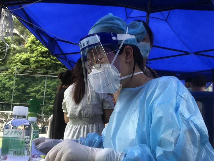 彭金碧2020年进入公共卫生学院,在研一上学期于学校完成课程学习后便前往广州进行新一轮的科研学习。今年5月,广州新冠肺炎疫情突然卷土重来,在当地确诊病例不断增加的情况下,彭金碧主动请缨加入疫情防控突击队。经过短期集中培训之后,彭金碧和其他队员坚持三天两夜“三班倒”,在珠海区核酸检测现场承担民众的预检分诊工作。