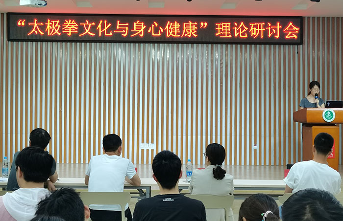6月18日下午,专家学者和师生代表齐聚一堂,围绕“太极拳文化与身心健康”主题进行理论探讨和交流。精神卫生与心理科学学院副院长朱春燕教授从脑科学的角度,深入阐述了规律习练太极拳促进心身健康的重要意义;人文医学学院体育部教师张忠兴以带教留学生太极拳的经历为切入点,介绍了架起太极拳对外交流桥梁、传播中华文化的重要性。第一临床医学院学生代表分别就习练太极拳对身心健康的诸多益处作了交流分享,生动展示出我校学子积极传承优秀传统文化,将其内化于心、外化于形的良好精神风貌。