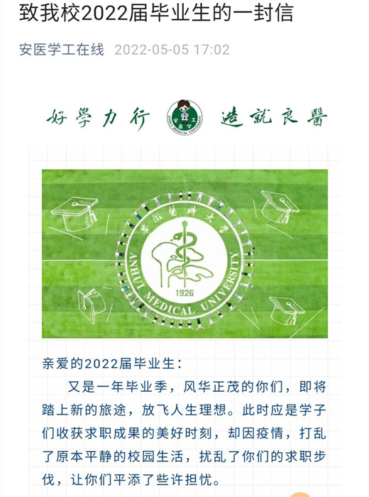 近日,由校大学生就业指导中心、党委研工部、校友会牵头先后发出致我校2022届毕业生、毕业生家长、全校教职医护员工、安医校友、用人单位和就业基地与研究生培养单位六封信,发动各方力量,汇集各类毕业生指导服务资源,发起毕业生就业冲锋号,千方百计全力以赴做好今年的毕业生就业工作。