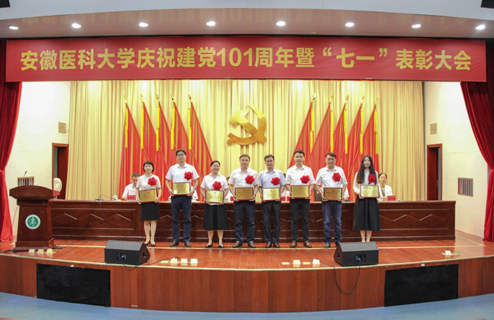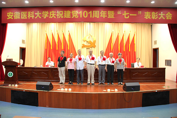 主席台就座的校领导为受表彰的优秀共产党员、优秀党务工作者、先进基层党组织和“光荣在党50年”纪念章获得者代表进行了颁奖。优秀共产党员代表、生物医学工程学院校聘副教授陈中嵘同志,优秀党务工作者代表、公共卫生学院教师第一党支部书记、安徽省特支计划领军人才朱鹏同志,先进基层党组织代表、安徽省公共卫生临床中心(第一附属医院北区)门急诊、医技第二党支部书记、团委兼职副书记沈杭同志,“光荣在党50年”纪念章获得者代表、校工会原主席洪良玉同志分别上台作了发言。