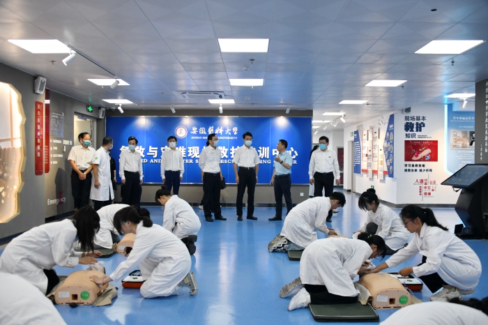 章柯一行实地参观了我校人体科学馆、红十字应急救护安医大工作站、基础医学虚拟仿真国家级实验教学示范中心等地,现场观看了心肺复苏操作演习。