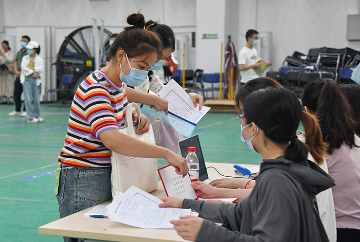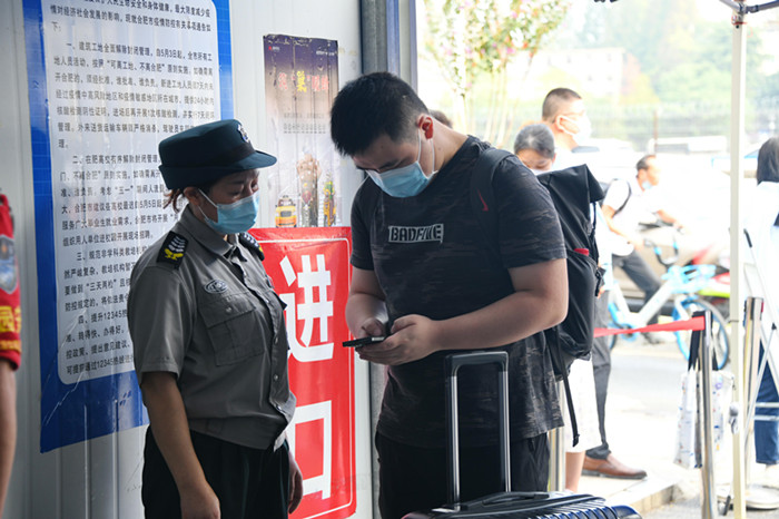 校本部前来报到的研究生新生在工作人员引导下,佩戴口罩、间隔1米以上,有序进入新生报到专用通道,在完成健康码、行程卡核验、48小时内核酸检测阴性证明、测量体温、手部清洁、更换口罩、行李消杀等流程后,来到各培养单位报到点正式办理报到手续。