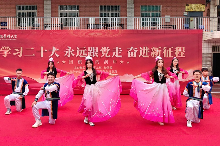 青春心向党,奋进新征程。活动中,第二临床医学院2022级麻醉学吴奕扬等同学表演的诗歌朗诵《青春心向党》,声情并茂地歌颂了伟大中国共产党的光辉历程,铿锵有力地表达了对伟大祖国的崇高敬意,生动诠释了在百年安医的孕育下,新时代安医青年“强国有我,赓续辉煌”的铮铮誓言。2022级临床医学艾力·扎提、康复治疗学郭倩茹等同学表演的《舞动新时代》,以青春之舞、青春之名,舞出满腔清澈挚爱,绽放民族团结深情,以青春最闪耀的模样,与祖国同频,与时代共振。