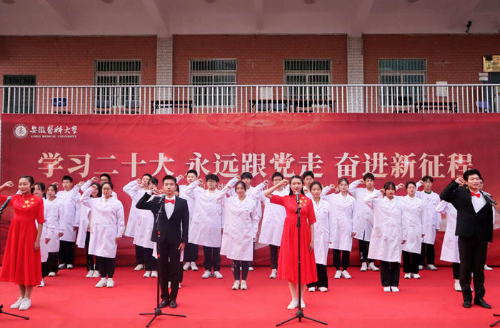 谢瑞瑾在国旗下宣讲党的二十大精神时说,作为未来的大国良医,同学们更应积极主动学习宣传贯彻党的二十大精神,切实把思想和行动统一到党的二十大精神上来,积极投身医疗卫生事业,矢志不渝护佑人民健康。他强调,作为新时代的安医青年,要勇做好学的榜样,始终牢记要学习知识,更要学会思考,学会研究的态度,学会终生受用的学科思维方式,用好施展才干的舞台,用真才实学照亮实现梦想的前景。要勇做力行的先锋,志存高远,奋进向上,提升价值塑造,把对祖国血浓于水、与人民同呼吸共命运的情感贯穿在学业全过程、融汇在良医路的实践中,在新征程上用实际行动彰显责任担当,更加奋发有为地为推进中华民族伟大复兴贡献青春力量。要勇做良医的典范,以有理想、敢担当、能吃苦、肯奋斗的青春姿态走好良医路,行好良医事,自觉弘扬“弘毅担当、精医报国、康民济世”的安医精神,以精湛医术成为生命的守护者,以高尚医德成为医疗卫生事业的忠诚践行者。