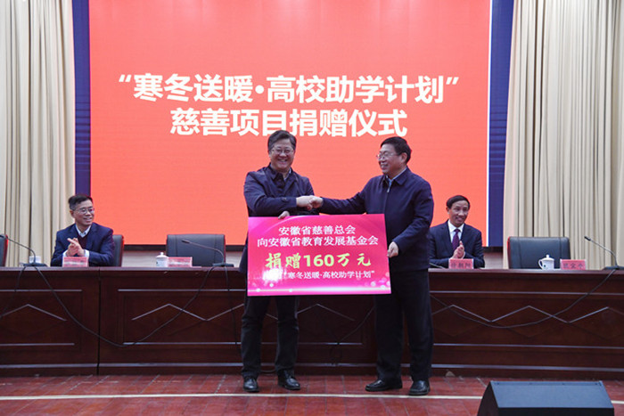 “寒冬送暖·高校助学计划”慈善项目由省慈善总会向省教育发展基金会捐赠160万元助学金,资助合肥工业大学、安徽大学、华体会平台、安徽中医药大学、安徽农业大学、合肥大学、安徽城市管理职业学院、安徽职业技术学院等八所高校困难大学生,每校20万元,资助标准和管理办法由受助高校根据实际情况自行制定。