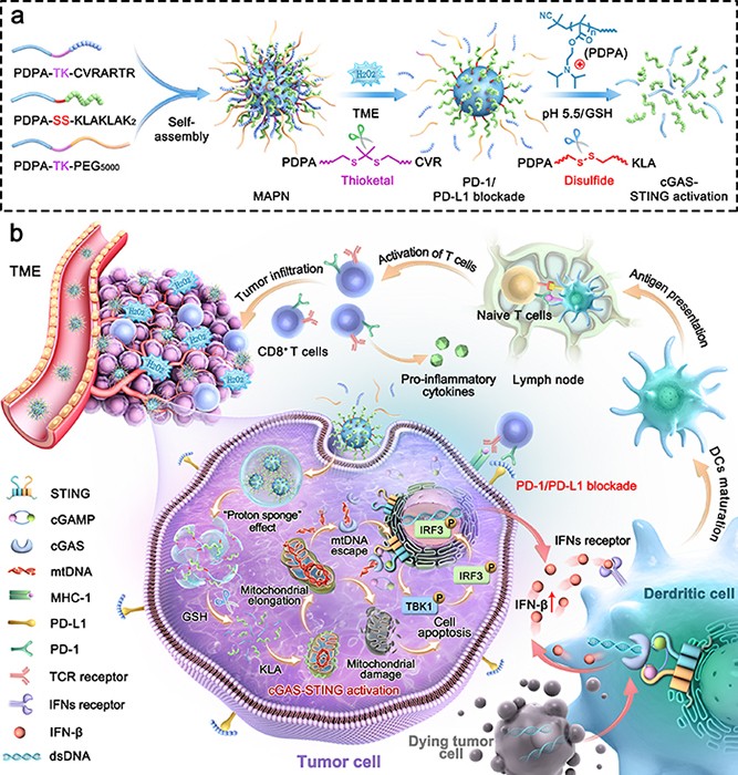 为精准激活cGAS-STING通路并协同阻断细胞程序性死亡-配体1(PD-L1)实现安全高效的癌症免疫治疗,该研究首次证明了基于抗菌肽的cGAS-STING信号通路激活,并开发了一种多刺激可激活的多肽纳米药物(MAPN)用于体内递送抗菌肽(KLA)和PD-L1拮抗肽(CVR)。为构建MAPN,该研究首先将KLA和CVR以二硫键或硫缩酮键偶联于聚丙烯酸二异丙基氨(PDPA)上,再与可响应性断裂的聚乙二醇化聚合物自组装,使MAPN在血液循环过程中避免被免疫清除,在肿瘤组织中高效富集。随后,MAPN进一步响应于肿瘤微环境中过氧化氢(H2O2)和肿瘤细胞内谷胱甘肽(GSH),实现KLA和CVR的位点特异性释放。