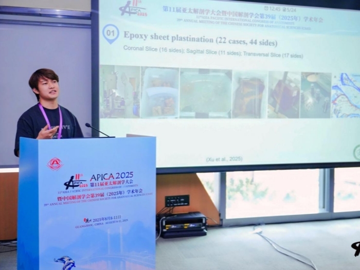 8月8日至11日,第十一届亚太解剖学大会暨中国解剖学会第39届学术年会在广州越秀国际会议中心召开,来自18个国家100多位外宾,以及国内解剖学领域的专家、学者和学生等800余人参与盛会。我校2022级临床医学专业本科生程盛参加会议并以英文口头报告形式进行学术汇报,展示其研究成果《三叉神经运动根的三维解剖:薄层塑化断层研究(Three-dimensional Anatomy of Motor Root: A Plastinated Sectional Study)》。