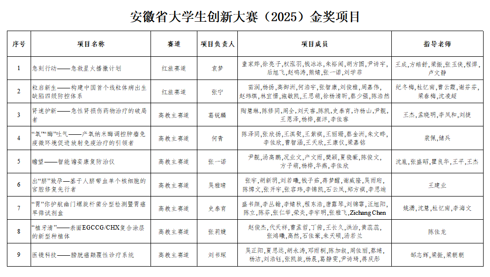 9月5日,安徽省教育厅正式公布安徽省大学生创新大赛(2025)获奖结果,我校师生表现优异,共获得金奖9项、银奖9项、铜奖32项,其中7个项目跻身全国总决赛。此外,学校9人获“优秀创新创业导师”荣誉,2人获“优秀工作者”荣誉,学校获大赛“优秀组织奖”。